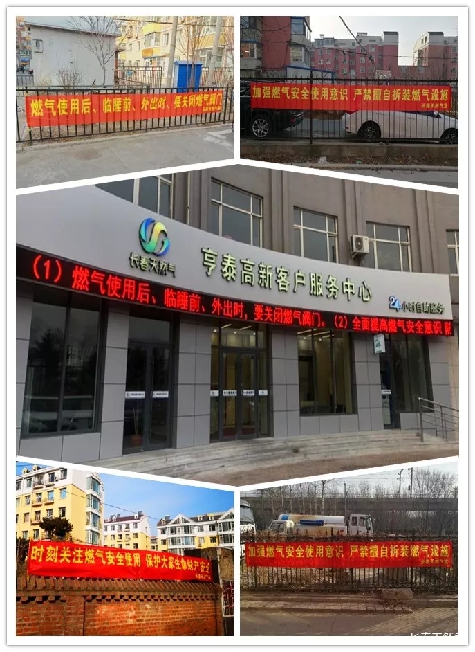 一是加大燃气用气宣传。在长春市区及农安县城所辖近600个小区悬挂安全用气知识条幅600条,向用户发放燃气事故警示案例宣传材料60000余份。同时,利用微信公众号、长天公司网站、新闻媒体、营业网点LED屏等媒介推出温馨提示、燃气安全常识等,用最直接、最醒目的方式唤起用户安全意识。