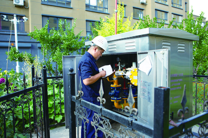长天集团工作人员在巡检天然气调压箱安全使用情况。