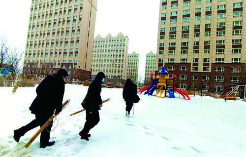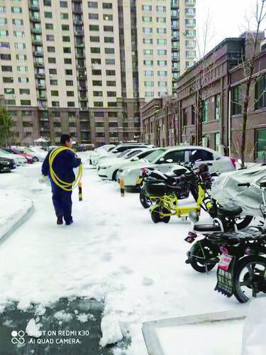 工作人员冒着大雪到小区服务用户。