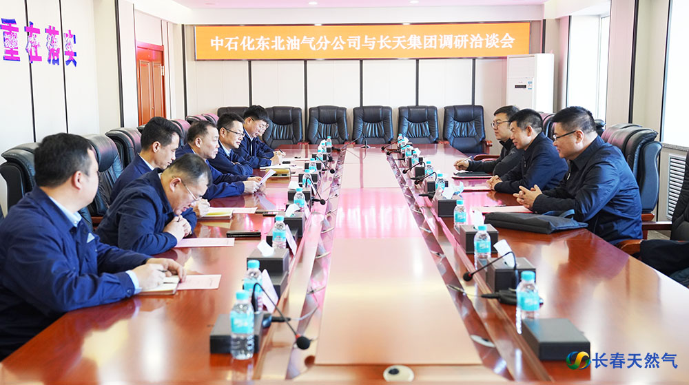 长天集团党委书记、董事长沈洪斌对马代鑫总经理一行的到来表示热烈欢迎,对中石化东北油气分公司一直以来在气源保障方面给予长天集团的大力支持表示感谢。他表示,中石化东北油气分公司拥有省内最优质的气源和地下储气库,未来与长天集团正在建设的LNG储配站项目将共同成为城市能源保障的有力支撑。期待能在清洁能源供应方面与中石化加强战略合作,为长春建设现代化都市圈、推进实施“六城联动”提供能源支撑。