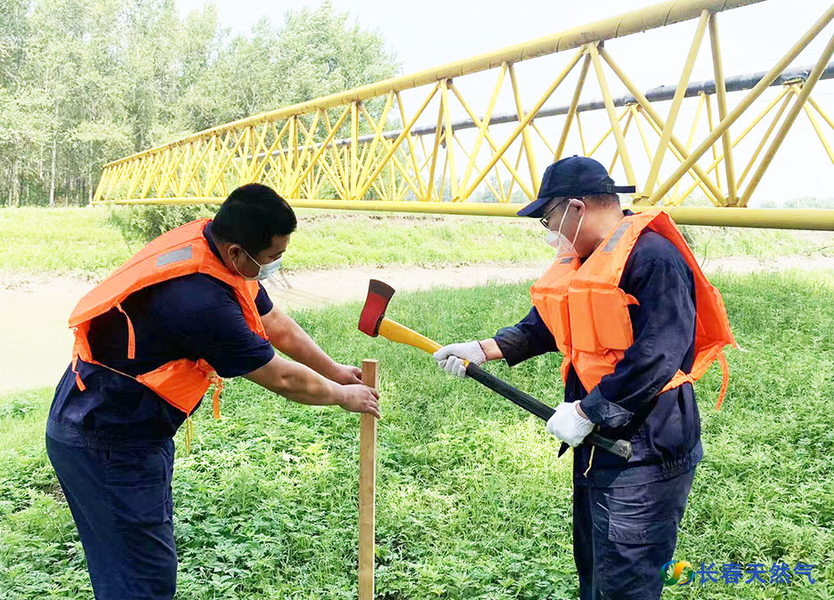利远公司操作工进行防汛加固堤坝作业。 贞达公司抢险维修人员更换站区安全阀。