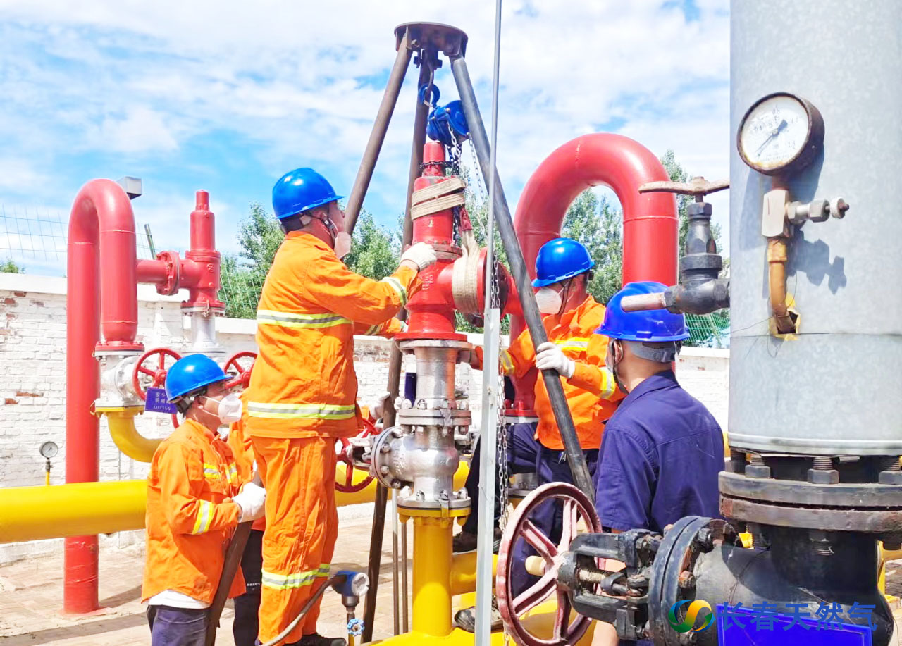 元盛公司工程人员在LNG应急调峰储配站现场 亨泰公司改线人员正在更换燃气立杠。