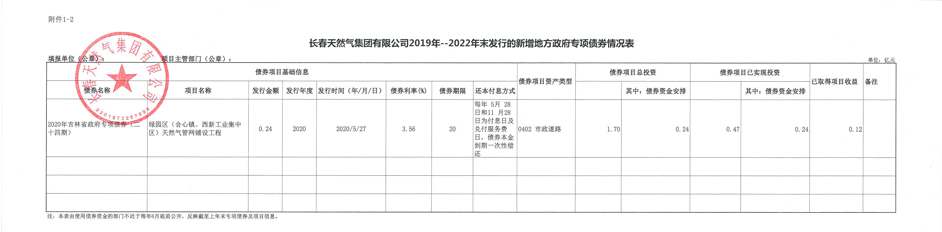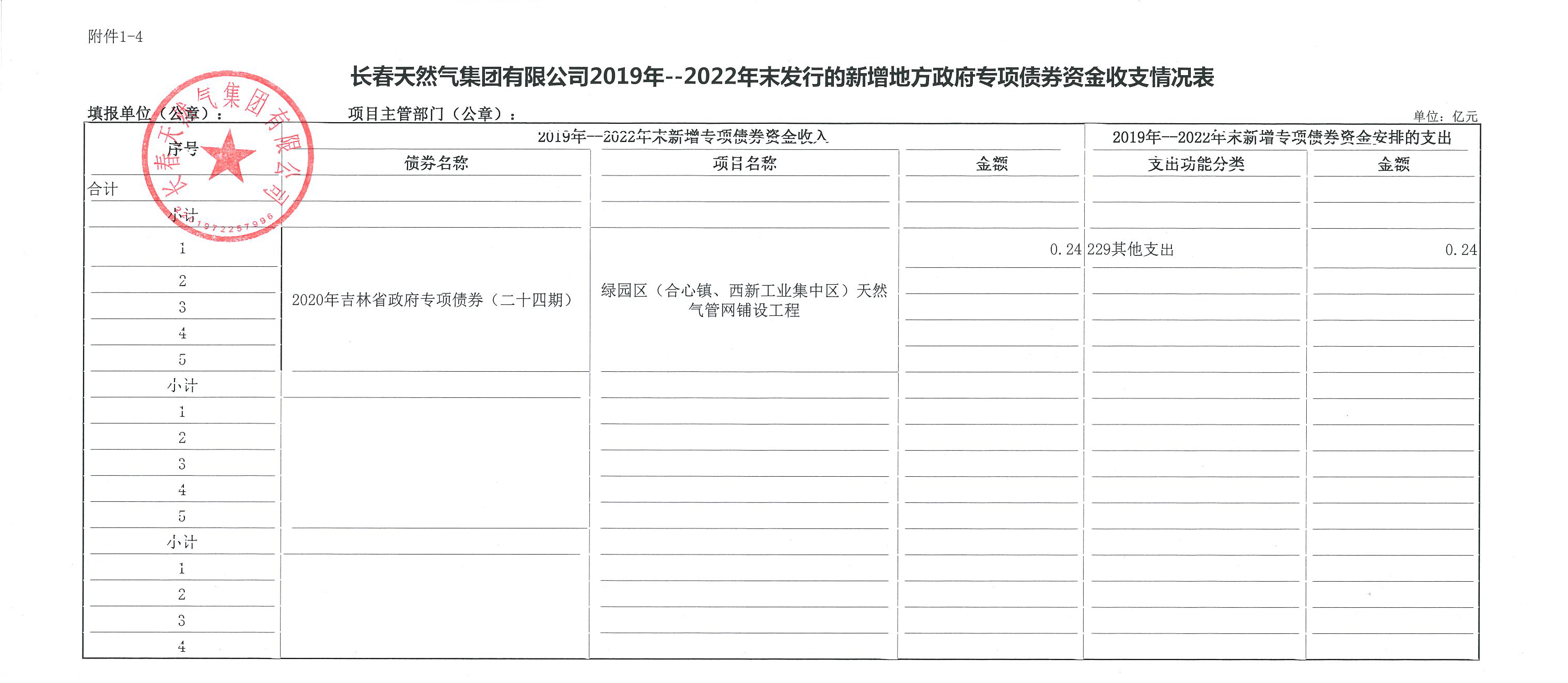 长春天然气集团有限公司2019年-2022年末发行的新增地方政府专项债券资金收支情况表