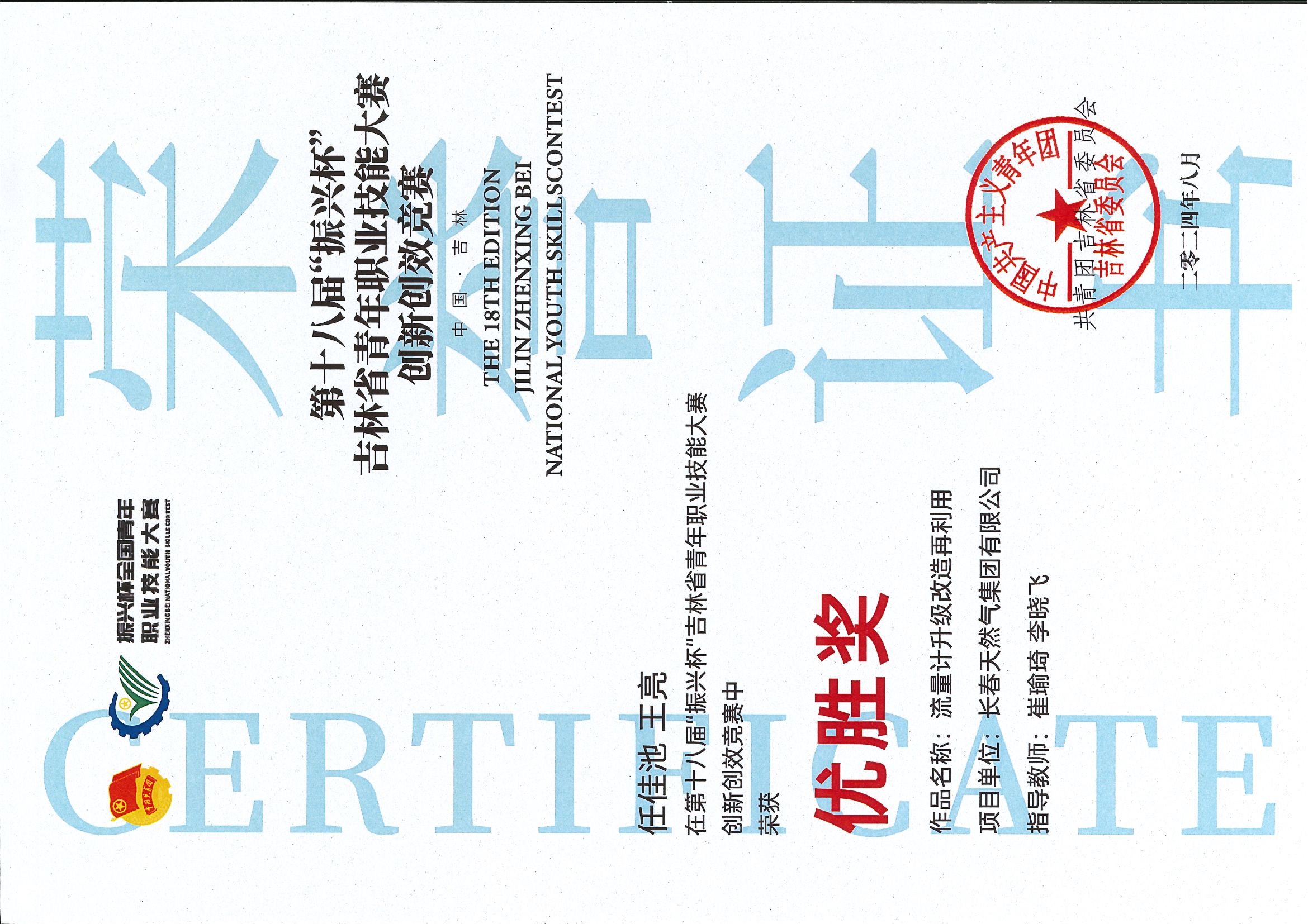 长天集团推送的“长天集团智慧燃气平台”、“流量计升级改造再利用”两个课题在第十八届“振兴杯”吉林省青年职业技能大赛创新创效专项赛中获得优胜奖。