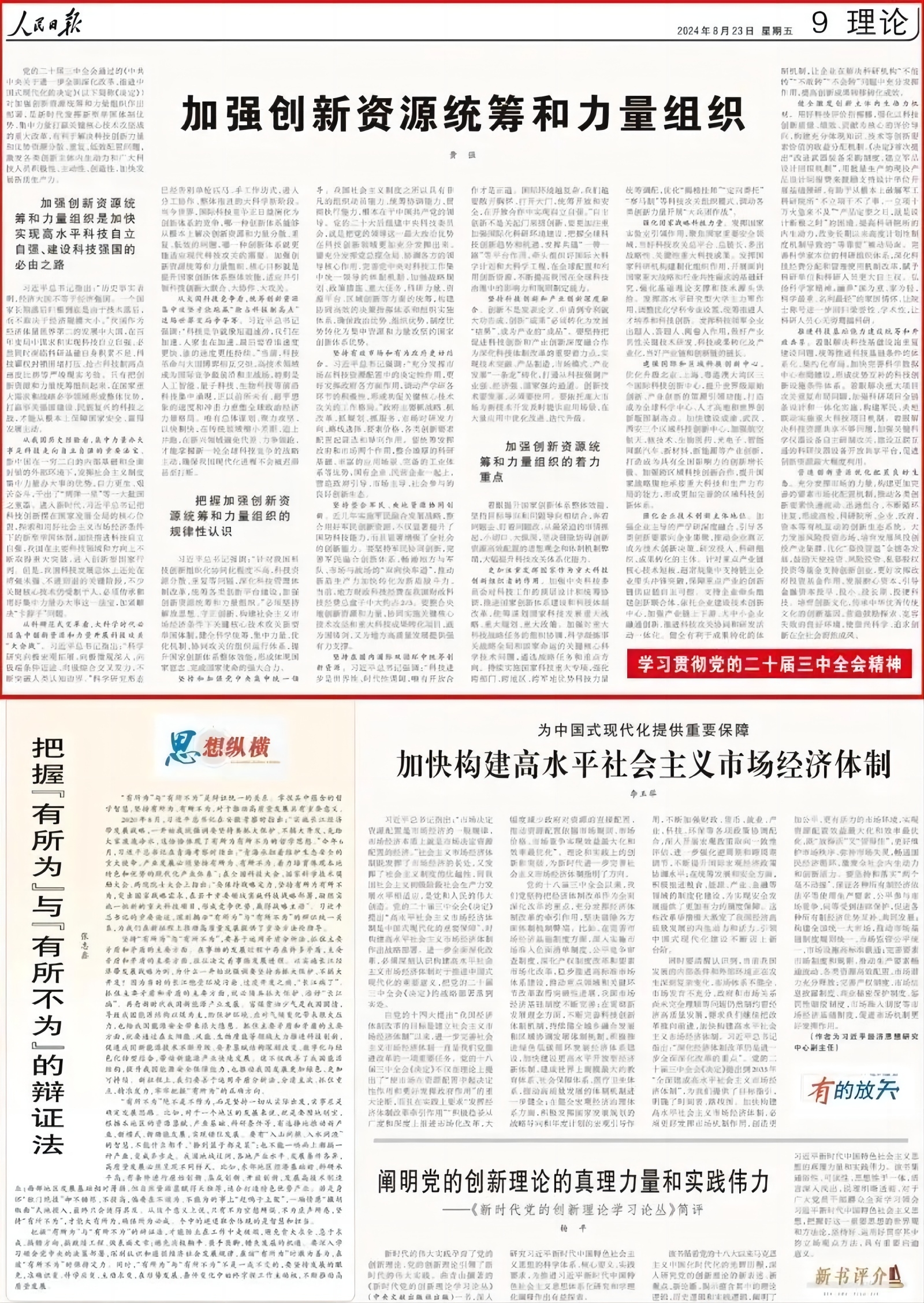 8月23日,《人民日报》理论版“学习贯彻党的二十届三中全会精神”栏目,刊发了吉林省委书记黄强的署名文章《加强创新资源统筹和力量组织》。全文如下: