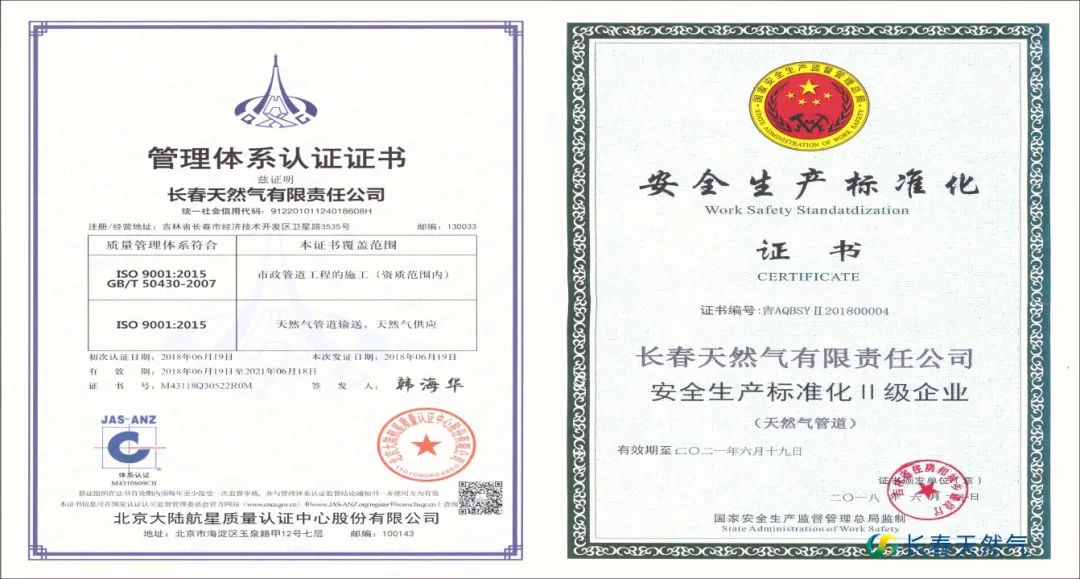 长天集团通过ISO9001质量管理体系认证和燃气行业二级安全生产标准化达标评审,集团质量管理体系达到国际标准要求,成为吉林省第一批通过二级安全生产标准化的企业。