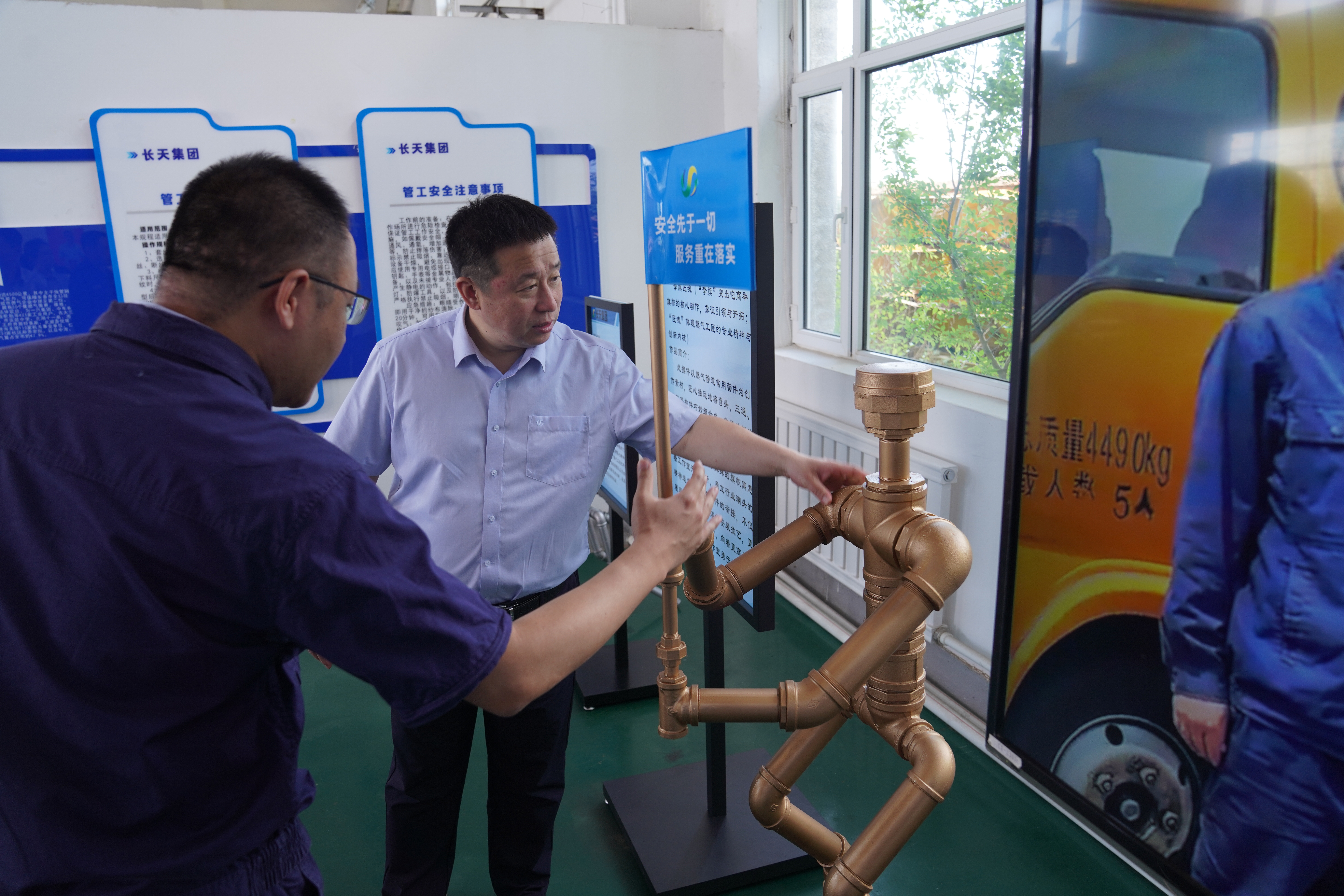 揭牌仪式结束后,与会人员实地参观了田洪岩、王辰创新工作室,并现场观摩创新成果展示。田洪岩创新工作室以电焊工艺创作“工匠精神”“不忘初心”系列作品,不仅生动彰显传承匠心、追求卓越的理念,更充分体现工程管道焊接标准化作业与抢险维修应急能力建设目标;王辰创新工作室以燃气管道常用管件为创作素材,通过巧妙组合弯头、三通、直管等构件,打造出“擎旗匠魂”“燃螳逐新”作品,深刻寓意引领行业发展、追逐前沿技术的坚定决心,展现出工作室成员的创新思维与精湛技艺。